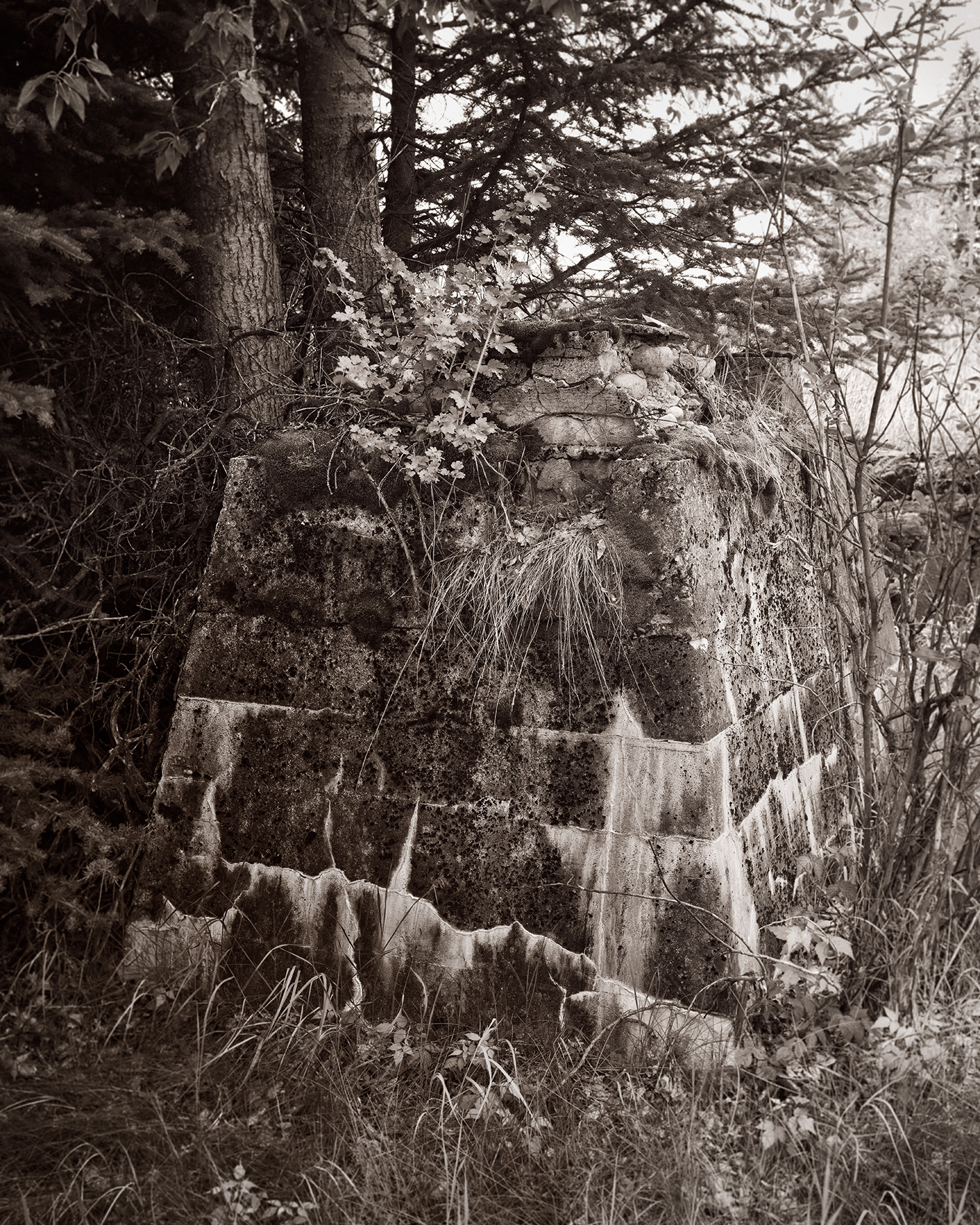 Unlike some early industrial locations in Alberta that were simply abandoned to the elements, or modern locations where environmental regulations require extensive reclamation efforts, the Bankhead town and mining operation near Banff was partially reclaimed in the early 1920’s. Most of the surface elements were removed when the mine shut down, including equipment and buildings. However things like foundations, heavy footings and concrete building shells were mostly left in place. This stone pylon located in the scant remains of the machine shop likely served as the support for a piece of heavy equipment, a hoist frame, or the like. For over 90 years it has been a silent witness to the resurgence of the surrounding forest. It will remain so for many decades more, until it is finally broken down by weather, freeze/thaw cycles, and the growing encroachment of roots large and small.