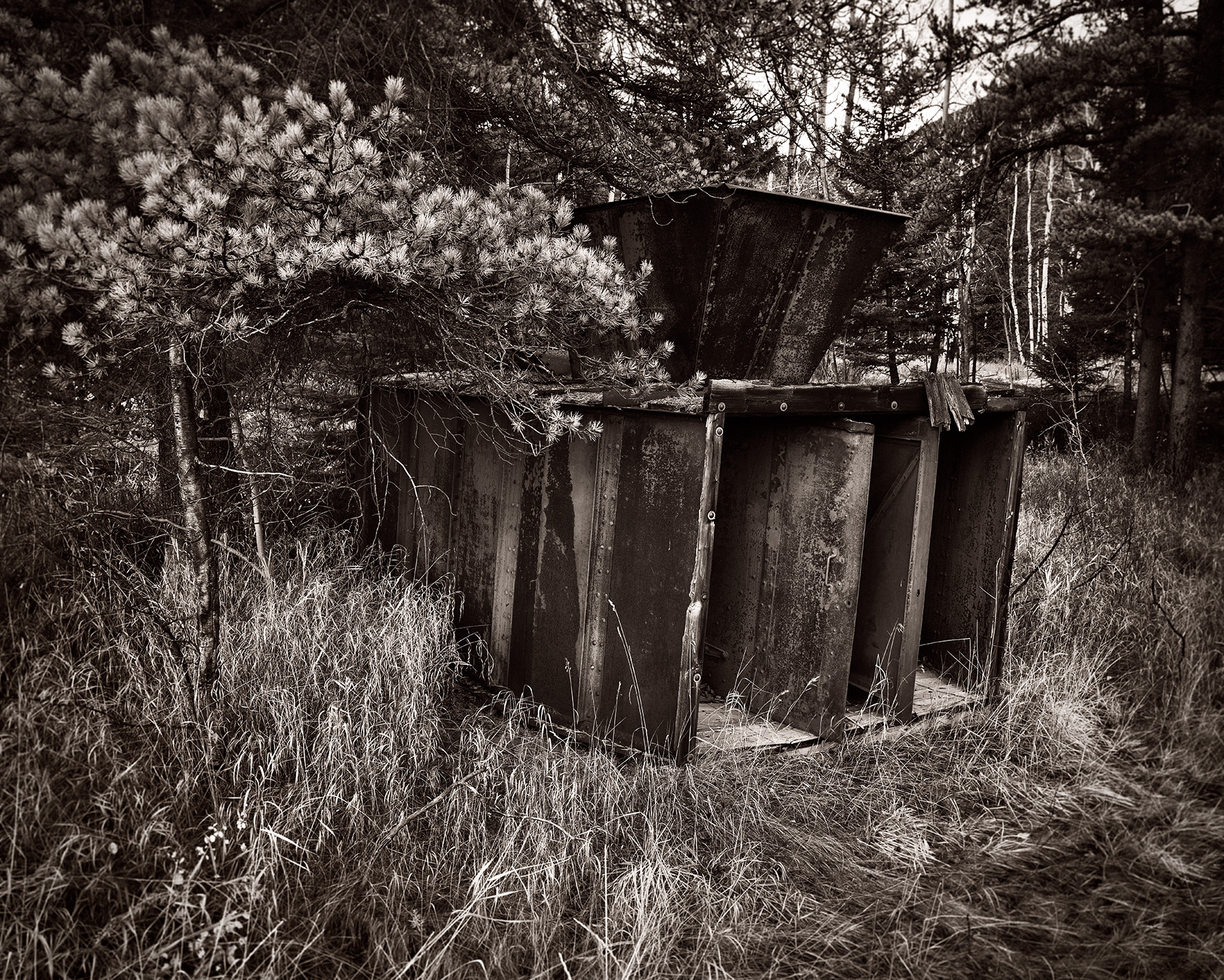 Like many other mines of the same era, coal at the Greenhill mine in Crowsnest Pass was dug out by miners working underground. Good air circulation was essential, both to prevent the build-up of explosive methane gas released by mining activities, and to enforce air exchange so miners could breathe. Temperature differentials between air at the surface level and below ground didn’t permit sufficient air movement without assistance, which was provided in the form of large intake / exhaust fans. Depending on the geometry of the active mine shafts and the surface vs. below-ground temperatures, the fans might be set to exhaust warmer air from below or push down warmer air from above. Typically a major network of shafts would employ one or two primary fans and then potentially several smaller auxiliary fans over outlying ventilation shafts. From the size of this fan unit, it appears to me to be an auxiliary. For decades now, since the mine closed in 1957, this fan’s tree-sheltered blades have had no force to them, perhaps only rocking a bit in reaction to the strong winds that blow through the Crowsnest region.
